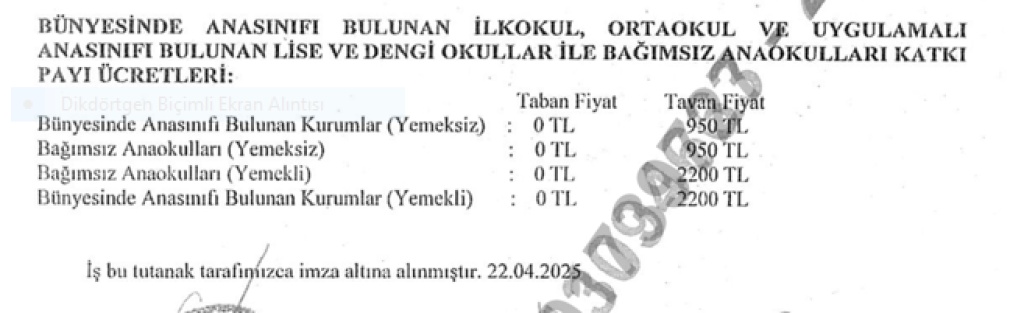 Milli Eğitim Bakanlığı Okul Öncesi Eğitim ve İlköğretim Kurumları Yönetmeliğinin 67. maddesi gereğince; 2025-2026 Eğitim-Öğretim yılında İlçemiz Okul Öncesi Eğitim Kurumlarında (anaokulu, uygulama sınıfı ve anasınıfı) alınacak aylık ücretlerin belirlenmesi amacıyla, 22 Nisan 2025 Salı günü saat 10:00'da, Okul Öncesi Kurumları Ücret Tespit Komisyonu Başkanı İlçe Milli Eğitim Müdürü Mustafa ANTEPLİOĞLU başkanlığında toplantıda aşağıdaki kararlar alınmıştır.